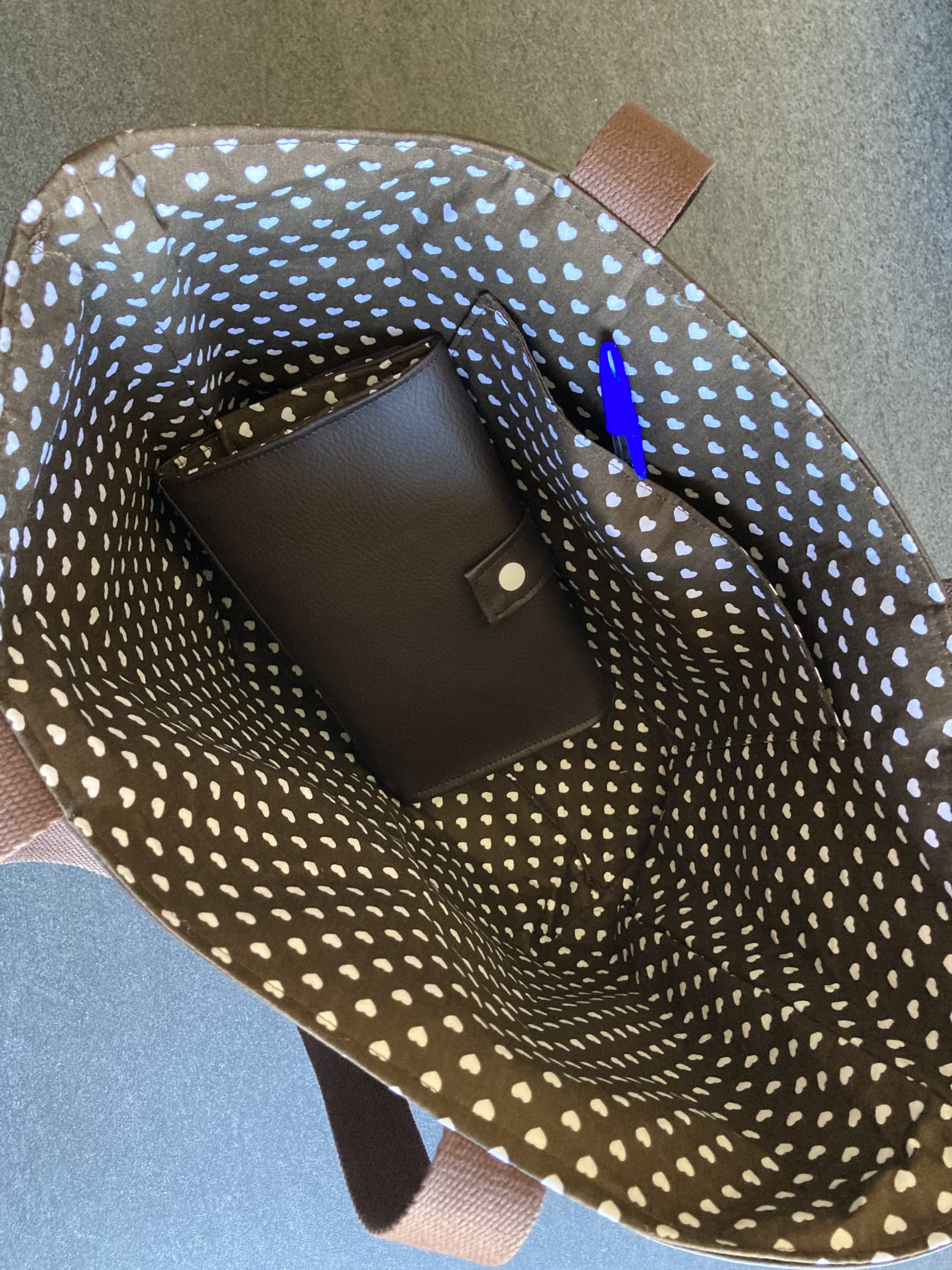 Sac cabas en simili cuir, doublé coton, une poche intérieure, sangle coton.